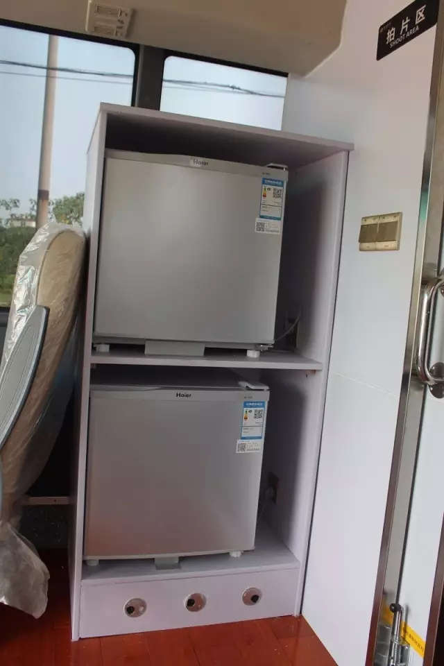 体检车上配备4台空调,2台海尔小冰箱,一台实木储物柜