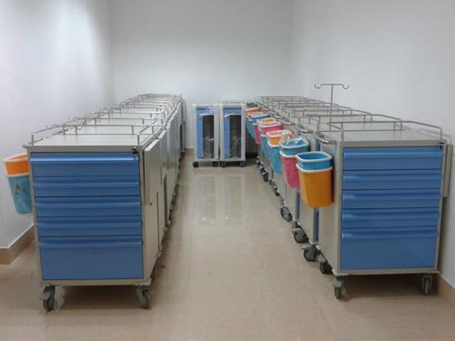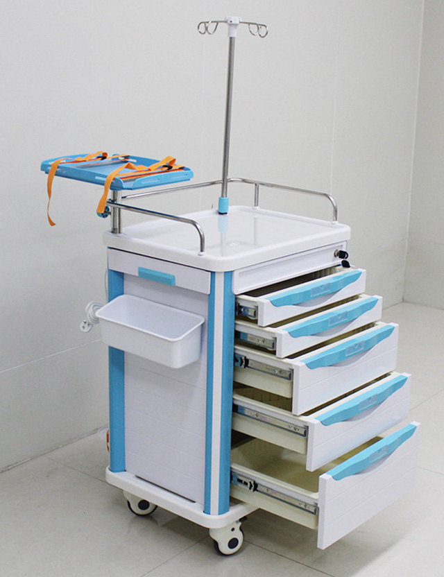 抢救车的基本构造是车体、轮子、还有医用橱柜。橱柜的柜体是放药品的空格。车体有固定氧气瓶的套筒。还配有输液架,还有多个放物品的抽屉。盖板可以盖住药物。采用了塑钢材料,包含工作台面,杂物箱,输液架,轮子,垃圾桶。一般分四个层次,急救药品区,放置一定数量的急救药品,根据药品使用频率来依次排列。输液区,放了输液器、注册器、留置针、止血贴、消毒棉、砂轮、等。呼吸物品区,开口器、压舌板、吸氧管、各种型号插管喉镜。其他物品,温度计、血压计、电筒、负压吸引器等。