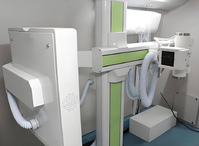 首先按下绿色的电源开关按键,整个车载DR设备就会通电。再按下高压发生器的开机键,然后电脑主机也开机运行。打开DR工作站系统,它开机的话有一个过程,需要几分钟时间,DR室门口有门开关跟当心电离辐射提醒标志。检查室里面有按钮可以把设备调高调低,检查时候这个手背着臀部上一点点,反向胸部靠着DR,通过升降来调整摆位的一个状态。还可以通过摇把来调整探测器跟球管的高度。还有线束器的一个调节。我们一般拍胸片的话,一般不用管这个操作。 一般出厂设置跳到了一个合适的范围了。控制平台也是可以控制开关门,并不需要按门口的按键。