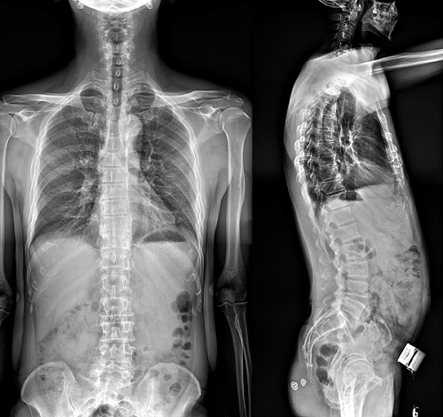 (7)全身拼接功能对有较大尺寸全脊柱拼接图接桂成金下股分成几次拍摄,再经过秋件开在骨科开展的全脊柱畸形矫治工作中,虽然CT. MRI也能获取全脊柱影像,接图像,以便于长度、角度、力线等测量和察脊柱在重力情况下但不能进行立位检查,无法观全景观察。全身拼接功能是高等级DR摄取患者立位全下的功能状态图像,因此采用动态医院特别看重的动态DR功能之一。注:图中Cobb脊柱正侧位图像是首选的检查方法角度的大小是反映侧弯严重程度的一个标准。