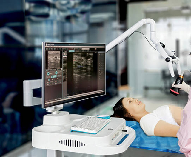 乳腺超声设备自动乳腺超声诊断,超声技术让广大女性有舒适快速的乳腺超声检查。检查开始的时候,首先在乳腺超声设备的工作列表输入患者的信息,简单直观的软件操作界面可以快速的输入受检人信息。并且选择适当的扫描深度和扫描顺序。取仰卧位海绵垫放在后背和臀部下面。并且在肩膀后面放枕头帮助定位。固定成检查有利姿势,有助于乳头朝向天花板。使乳腺组织均匀分布,正常的摆位是高质量,可回顾性检查的必要条件。