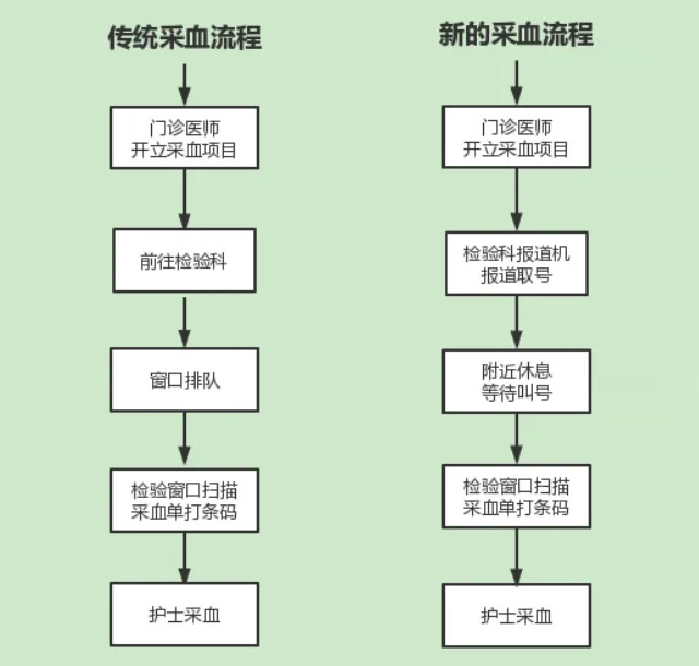 门诊医师开采血项目>报道机报道取号>座位休息等待叫号机叫号>检验窗口扫描采血单条码>护士采血