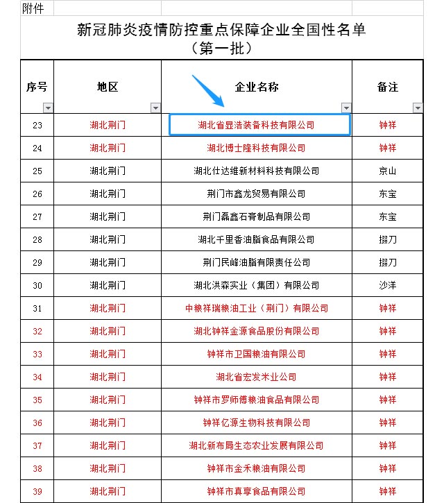 湖北省显浩装备科技有限公司被省经济和信息化厅列入新冠肺炎疫情防控全国重点保障企业(第一批)名单。