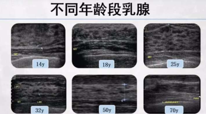 正常乳腺超声声像图,乳腺超声设备高分辨力超声能够清晰显示乳腺及其周围组织的解剖结构。可以看到乳腺腺体,高回声的皮肤层,低回声的皮下脂肪层,然后是乳腺的腺体结构,那么后方的是乳腺腺体后脂肪,胸大肌,胸膜,乳腺的支撑机构韧带。乳腺扫查的时候乳头乳晕区的扫查。乳头的病变率还是有的。使用多量耦合剂观察,对乳头非常细致的扫查。观察乳腺乳头的情况跟改变。乳头边界清楚的外凸圆形结节,均匀的中等回声,后方都伴有声影。乳腺导管与小叶,类似一小串葡萄。